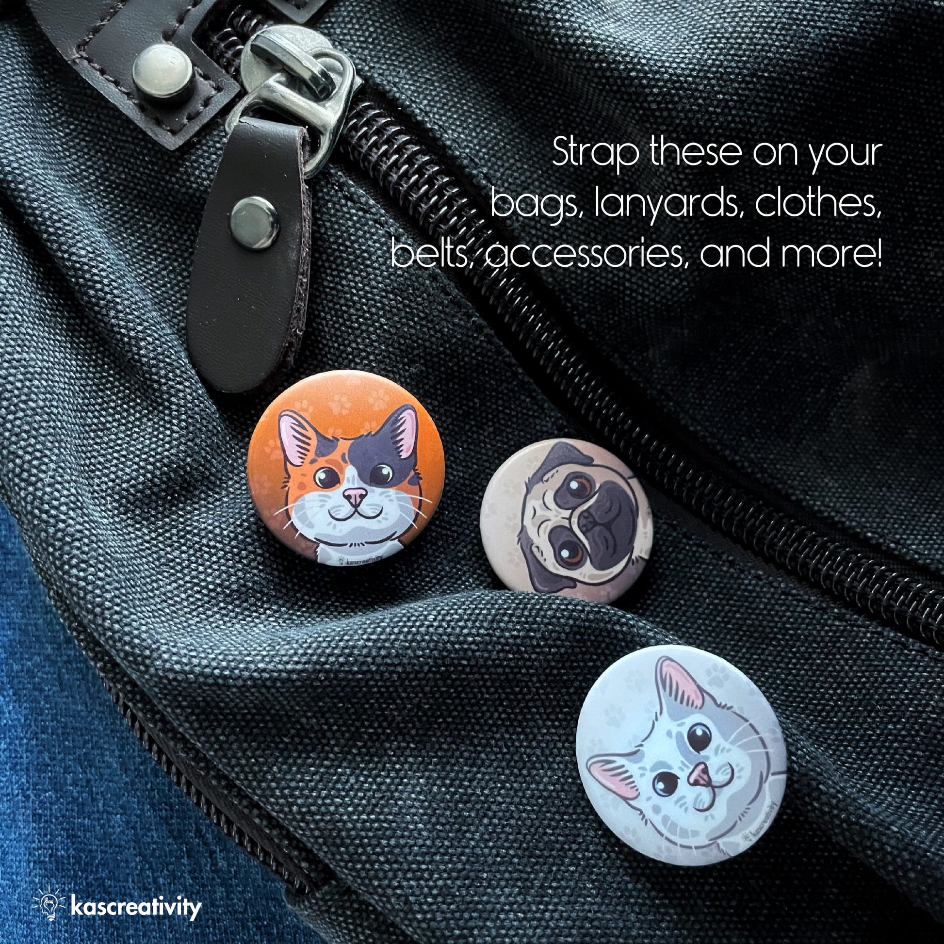 Our original Dogs and Cats designs, as small, adorable pins! Strap these on your bags, lanyards, clothes, belts, accessories, and more! Bring your beloved pets with you wherever you go.